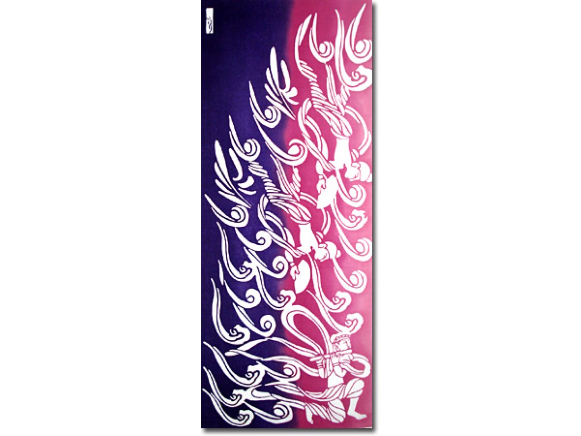 The technique used for dyeing these tenugui is a traditional Japanese stencil dyeing method known as Ise Katagami. A few sheets of durable Japanese Washi paper are bound together and persimmon tannin is then applied. Experienced craftsmen carve out the design, bit by bit, with a chisel. When the carving is ready, a thin mesh of silk, called “Sha”, is applied to the surface before the lacquer is applied. Each procedure requires tremendous concentration and time-honored techniques applied by experienced craftsmen.